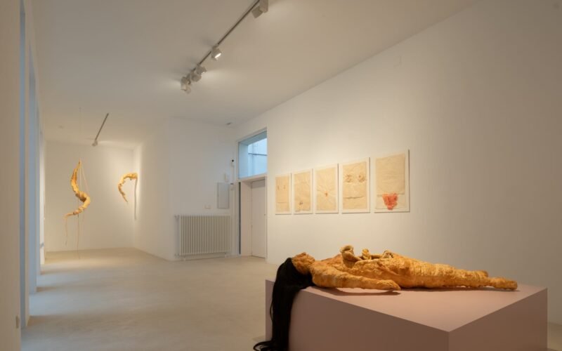Las esculturas de Maya Pita-Romero (Madrid, 26 años), las únicas comisionadas específicamente para esta muestra, también imponen nuevas imágenes del cuerpo. Evocan lenguas, gargantas o cavidades que oscilan entre lo erótico, lo visceral y lo inquietante. Se sitúan en el terreno de lo liminal. No se sabe si están dentro o fuera. Pita-Romero, que ha sido galardonada con el Premio Artista Joven 2026 de la Casa Encendida, ha utilizado materiales heredados de su linaje femenino y plásticos reciclados; lo doméstico evoca la calidez, pero también lo abyecto.