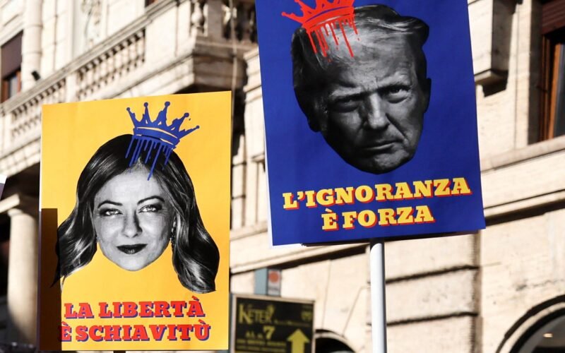 Una protesta en Roma, el pasado 28 de marzo, con carteles contra la primera ministra italiana Giorgia Meloni y el presidente estadounidense Donald Trump.