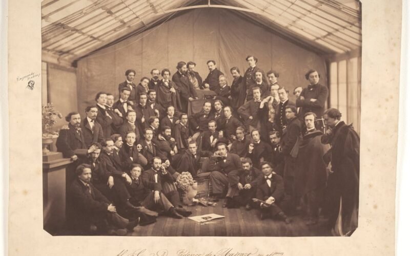 La imagen que abre el recorrido funciona no solo como exponente de la relación simbiótica que los artistas entablaron con la fotografía, sino que hace también las veces de documento histórico de lo que eran los estudios fotográficos en el siglo XIX, construcciones completamente acristaladas para aprovechar la luz natural que se solían situar en las azoteas de los edificios. En esta Artistas en el estudio del fotógrafo (1857-58) posan para Ángel Alonso Martínez un grupo de estudiantes y sus profesores de la Academia de Bellas Artes de San Fernando—entre los que se identifica a Carlos Luis de Ribera, Carlos de Haes, Federico de Madrazo y Juan Antonio Ribera— en el que fuera el estudio más importante de Madrid, ubicado en el pasaje de la Murga, junto a la calle Montera.