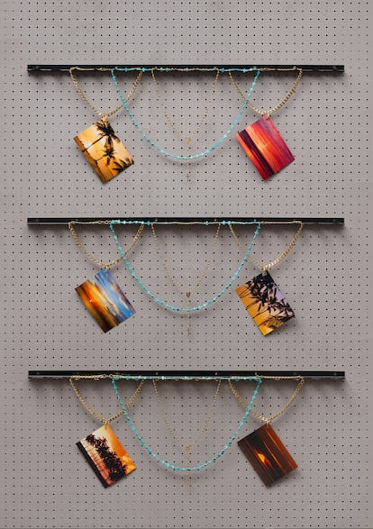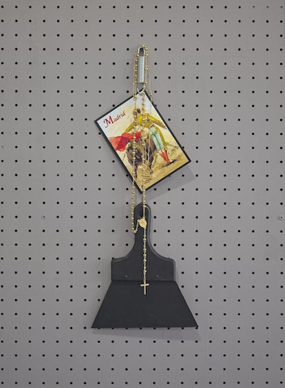 En estas imágenes, que también tienen algo de trampantojo barroco, comparecen serruchos, martillos, espátulas o guantes de trabajo, pero también amuletos o piezas de bisutería, así como postales turísticas de un marcado registro kitsch: “Muchas son fotos estereotipadas de Madrid o de playas con palmeras, porque me gusta esa idea de la fotografía dentro de la fotografía”. El título de esta serie, Equilibrios, homenajea a otra llamada igual del dúo artístico suizo Peter Fischli y David Weiss, consistente en unas pequeñas esculturas construidas con elementos de cocina. “Uso el lenguaje del arte, las referencias intra y extraartísticas, todo junto como en un cocido madrileño”, define Hamilton. “Porque me gusta esa cosa entre dadá y surrealistona, de unir objetos que pertenecen a universos distintos para crear un comentario político”.
